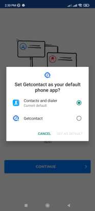 7. You can choose one of them, contact and dialer or get contact or cancel this pop up. If you choose Getcontact, and when you get a call, the screen of your mobile will show the name tag suddenly.
